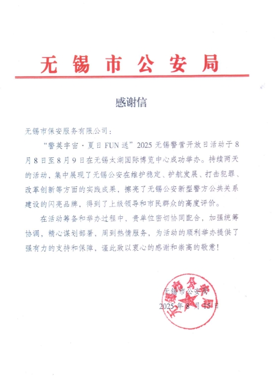 熱情服務(wù),彰顯擔當 ——公司獲無錫市公安局感謝信